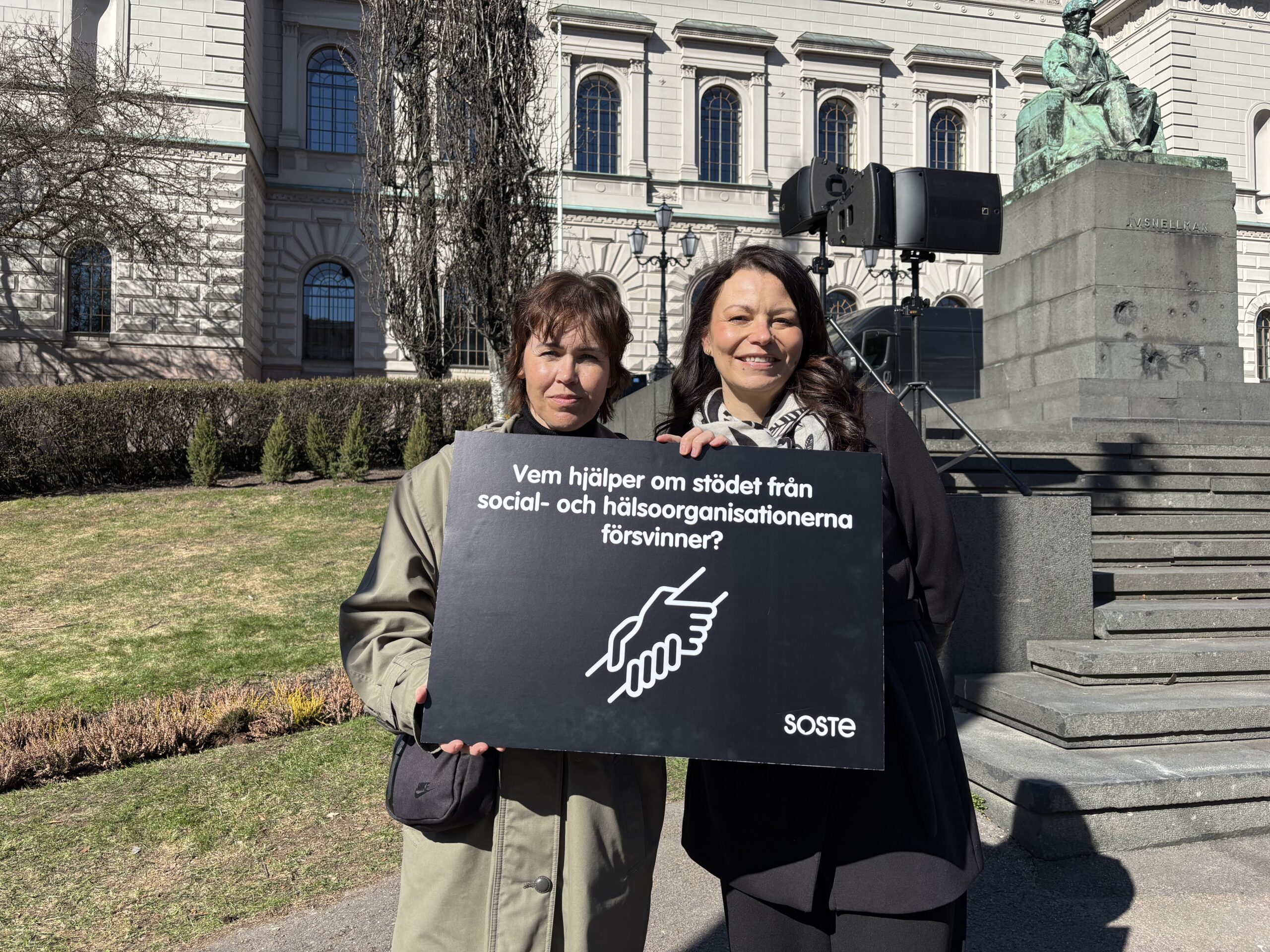 På Snellmansplanen samlades i dag den 21 april över 120 organisationer i en demonstration mot regeringens planerade och genomförda nedskärningar i socialbidrag till stats- och hälsovårdssektorn. Enligt arrangören SOSTE riskerar nedskärningarna att påverka lågtröskeltjänster som bland annat rådgivning, kamratstöd, frivilligverksamhet samt chatt- och kristelefontjänster.